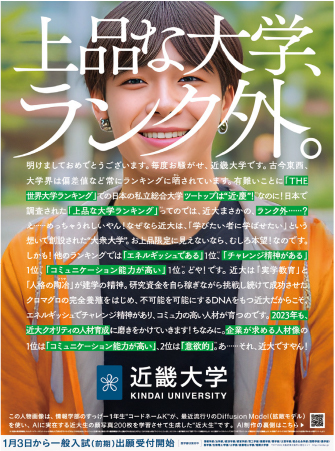 近畿大学では毎年正月に新聞広告を掲載しており、そのユニークさが話題となっています。2023年のテーマは「上品な大学、ランク外。」で、制作を担当したのは同大学情報学部の1年生です。この広告は2023年1月3日、全国紙やスポーツ新聞など11紙に掲載されました。広告を見た人に「近畿大学はやっぱり面白い」と思ってもらうことを目的としており、その役割を十分に果たした作品と言えるでしょう。