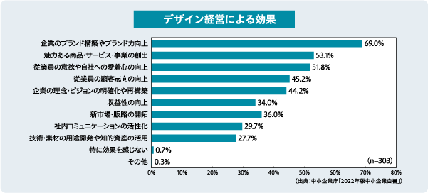 「2022年版中小企業白書」によると、デザイン経営が定着している中小企業に「デザイン経営による効果」についてのアンケート調査を実施したところ、最も多かった回答が「企業のブランド構築やブランド力向上」(69.0%)だった。次に「魅力ある商品・サービス・事業の創出」(53. 1%)、続いて「従業員の意欲や自社への愛着心の向上」(51. 8%)となっている。(グラフ参照、複数回答)