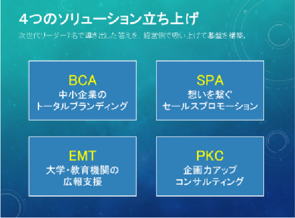 2024年に新生フロットを立ち上げる際、17名によるチームを編成し、ソリューションチームBCA(+BRANDING)で開発したオリジナルのブランディングツールを使って「まじわり、かかわり、むきあい、挑戦する人・地域のオモイとコタエをはぐくむ。ともに歩み、ミライへ。」というブランドコンセプトを策定した。そこから経営側で吸い上げて、「中小企業支援トータルブランディング」「想いを繋ぐセールスプロモーション」「大学・教育機関の広報支援」「企画力アップコンサルティング」という独自の4つのソリューションを立ち上げた。