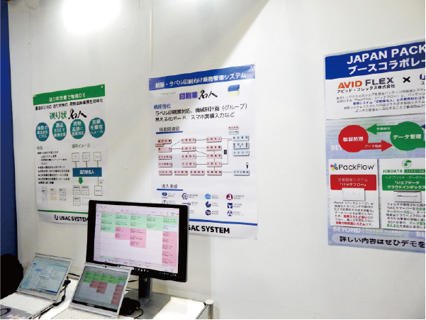 ユーザックシステム㈱は、紙器・ラベル印刷向け業務管理システムを出展した。パッケージ用製版システム「Pack#」(パックシャープ)を自動化する「PackFlow」(パックフロー)と、紙器・ラベル業界向け業務管理システム「印刷業名人」のコラボレーションによるシステムである。業務管理システムで入力した内容がそのまま製版システムに直結するだけでなく、データ管理も一元化して事故防止と効率化を実現している。機械別計画グループでの閲覧・変更が可能で、スマートフォンによる作業実績入力にも対応している。