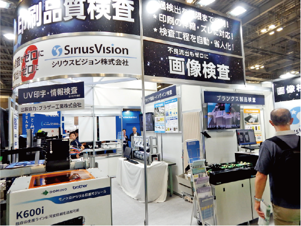 シリウスビジョン㈱はブラザー工業㈱の協力を得て、ブラザー工業社製UV印字機に搭載したインライン検査を出展した。後印字による印刷バラツキや位置ずれ、伸び縮みに強い画像検査技術を解決するもので、文字欠けやつぶれといった印字品質と、文字認識OCR、バーコード・QRコード読取データ照合、連番検査といった印字内容の情報検査を同時に実現するシステムである。