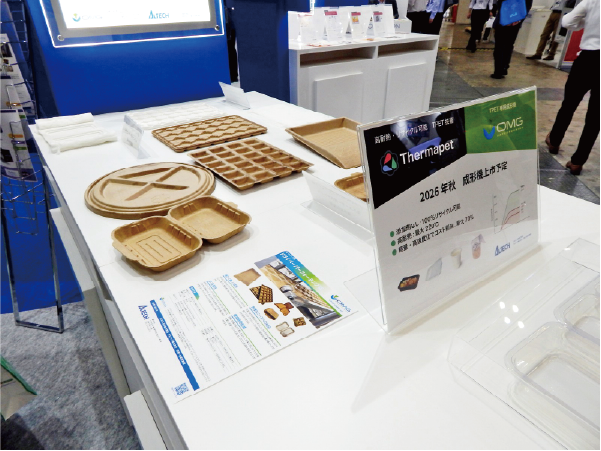 アルテック㈱がOMG社製(イタリア)のドライペーパーフォーミング機(紙成型機)を出展した。複雑な形状の紙容器製造において、水をほとんど使用しない製品だ。電力やCO2の消費を格段に抑えつつも高い生産性を実現し、排水処理設備が不要で設置場所の制限がないのがメリットである。ブースではサンプルを展示し、高い成形性をアピールした。