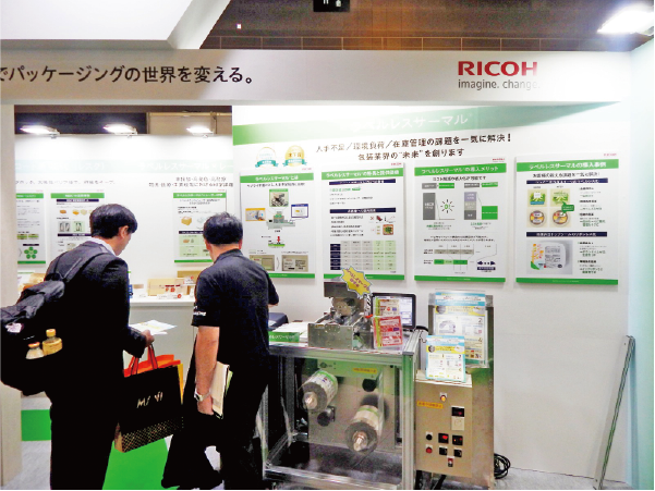 RNスマートパッケージング㈱は、次世代の包装資材ソリューションを紹介した。新製品では、リコーの独自技術による自動蒸通機能を有した包材である「スマレンジ」を出展。同製品は一般的な蒸気圧でフィルムを破るのではなく、内圧に依存しないマイクロ波で自然に穴が開く画期的な蒸通フィルム。その他では、紙素材でありながらガスバリア性、フレーバーバリア性、耐油性を有し、リサイクル性にも優れたプラスチック包材に代わる包装資材「バリアコート紙RESC(レスク)」や、フィルムや紙基材などへの直接印字が可能で、ラベルやリボンなどのサプライが不要な環境に対応した包装材『ラベルレスサーマル』などを出展した。