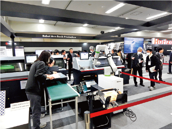 プリンターインラインダイカットシステムとして、分離装置「SPC-N4055」、型抜き装置「RD-N4055」、シートバッファモジュール「SBM-200RD」の型抜き・断裁システム、AGV 連携中綴じシステムとして、「iCE STITCHLINERMark V」/給紙装置「HSF-50」、オートスタック・帯掛け・デリバリ装置「gamma502 HO Japan Edition」、ロボット投入無線綴じシステムとして、協働ロボット+セパレーター、無線綴じ機1クランプタイプ「iCE BINDER BQ-300」、三方断裁機「iCE TRIMMER HT-300」などを出展し、同社のスマートァクトリー構想を提案した。