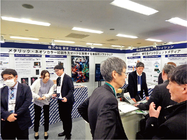 ㈱新星コーポレィションは、「デジタル印刷の5色目が印刷に付加価値を作る」をテーマに、メタリックカラー印刷を効率化する「Color-Logic Design Tool Kit」およびピンク、グリーンを加えた拡張された印刷色再現を簡単に行える「Touch7」や、メタライズフィルム出力可能のラミネーター「GDRR380」を紹介した。