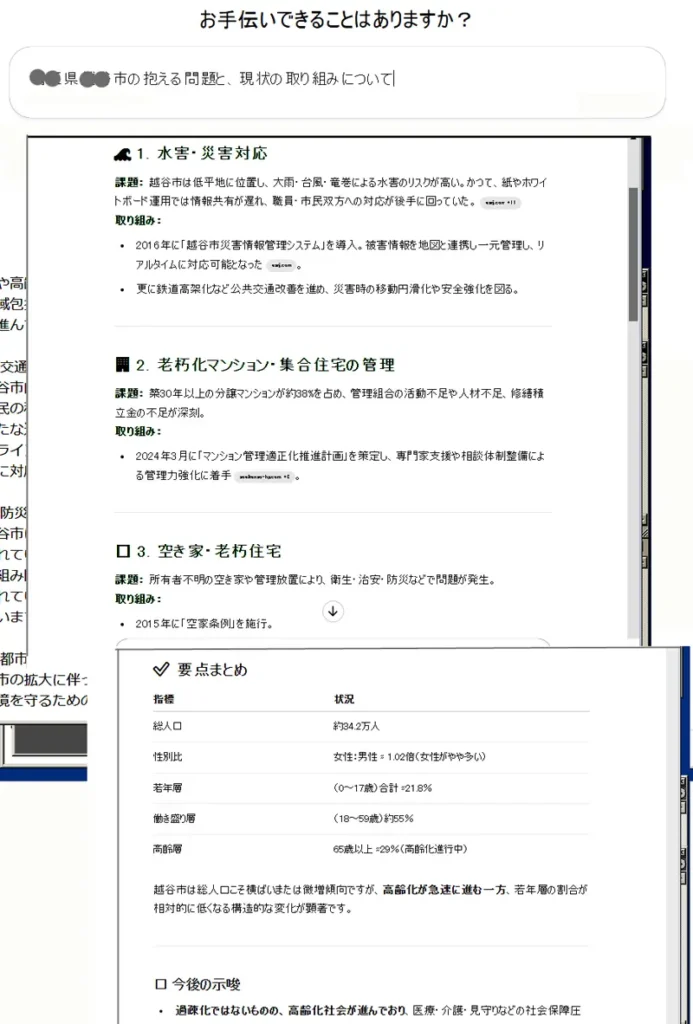 ChatGPT を開いて、「N市の抱える問題と、現状の取組について」問い合わせると、以下のように結構長文のレポートが出てきます。各文の最後には参照したURLがでていますので、そこから詳細を開くことができます。