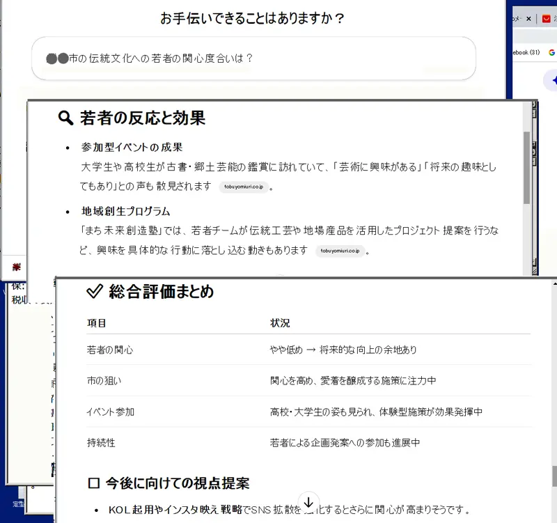 これも結構長いレポートが出てきて、「若者が興味を持つような伝統文化に関するイベント」に企画の焦点をあててみる。このレポートにも多くの参照記事のURLがついているので、詳細が容易に確認できる。